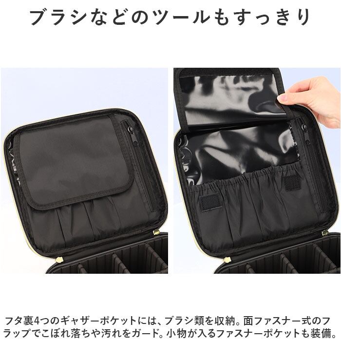 ・フタ裏4つのギャザーポケットには、ブラシ類を収納。面ファスナー式のフラップでこぼれ落ちや汚れをガード。小物が入るファスナーポケットも装備。