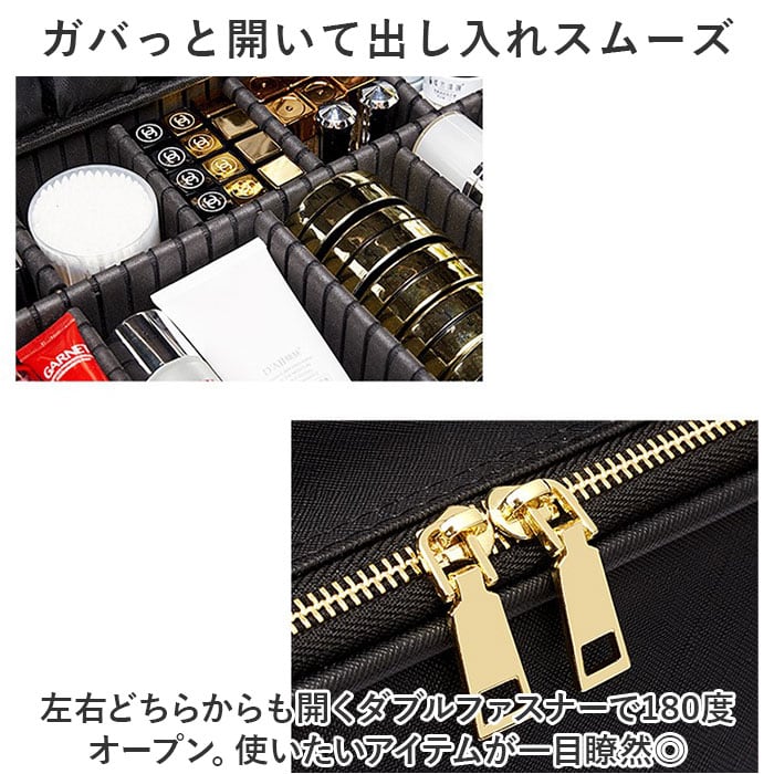 ・左右どちらからも開くダブルファスナーで180度オープン。使いたいアイテムが一目瞭然◎