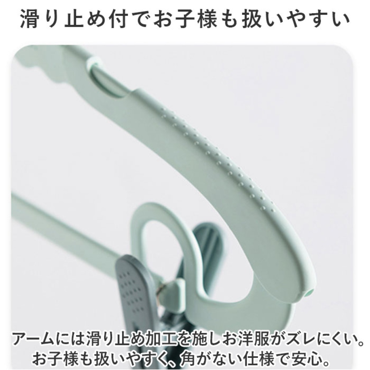 ・アームには滑り止め加工を施しお洋服がズレにくい。お子様も扱いやすく、角がない仕様で安心。