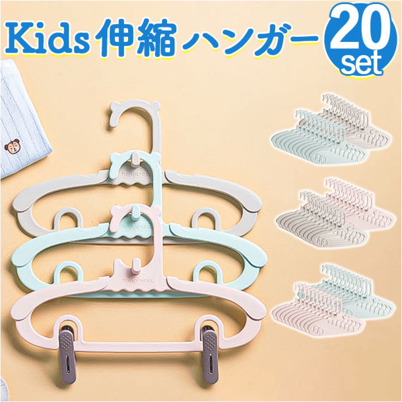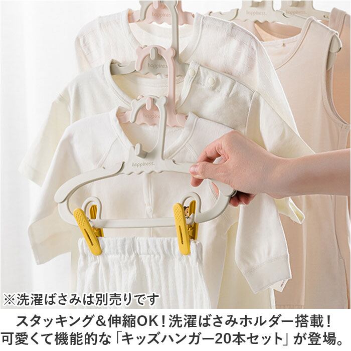 ・スタッキング&伸縮OK!洗濯ばさみホルダー搭載!可愛くて機能的な「キッズハンガー20本セット」が登場。