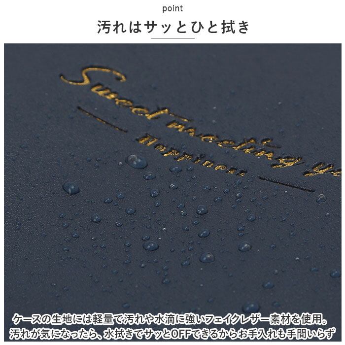 ・ケースの生地には軽量で汚れや水滴に強いフェイクレザー素材を使用。汚れが気になったら、水拭きでサッとOFFできるからお手入れも手間いらず。
