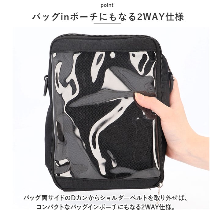 ・バッグ両サイドのDカンからショルダーベルトを取り外せば、コンパクトなバッグインポーチにもなる2WAY仕様。