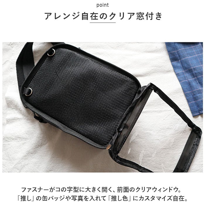 ・ファスナーがコの字型に大きく開く、前面のクリアウィンドウがこの痛バッグのヒ・ミ・ツ。「推し」の缶バッジや写真を入れて「推し色」にカスタマイズ自在。