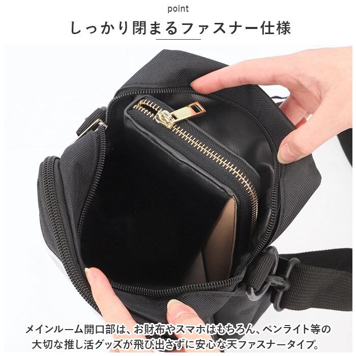 ・メインルーム開口部は、お財布やスマホはもちろん、ペンライト等の大切な推し活グッズが飛び出さずに安心な天ファスナータイプ。