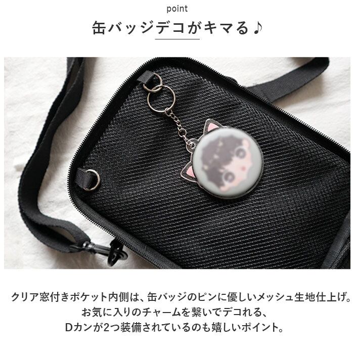 ・クリア窓付きポケット内側は、缶バッジのピンに優しいメッシュ生地仕上げ。お気に入りのチャームを繋いでデコれる、Dカンが2つ装備されているのも嬉しいポイント。