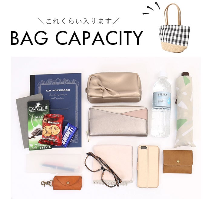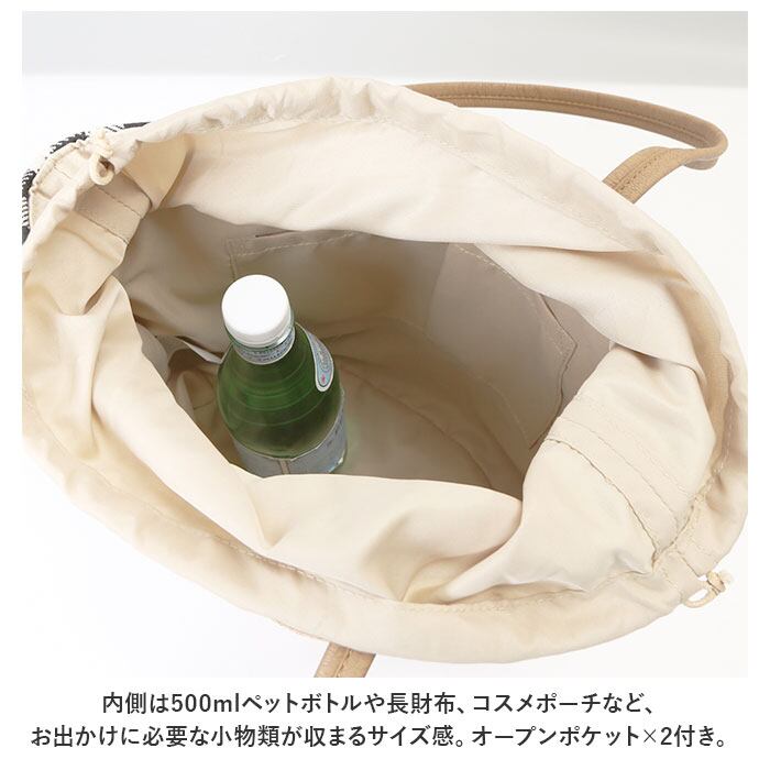 ・内側は500mlペットボトルや長財布、コスメポーチなど、お出かけに必要な小物類が収まるサイズ感。オープンポケット×2付き。