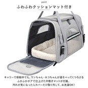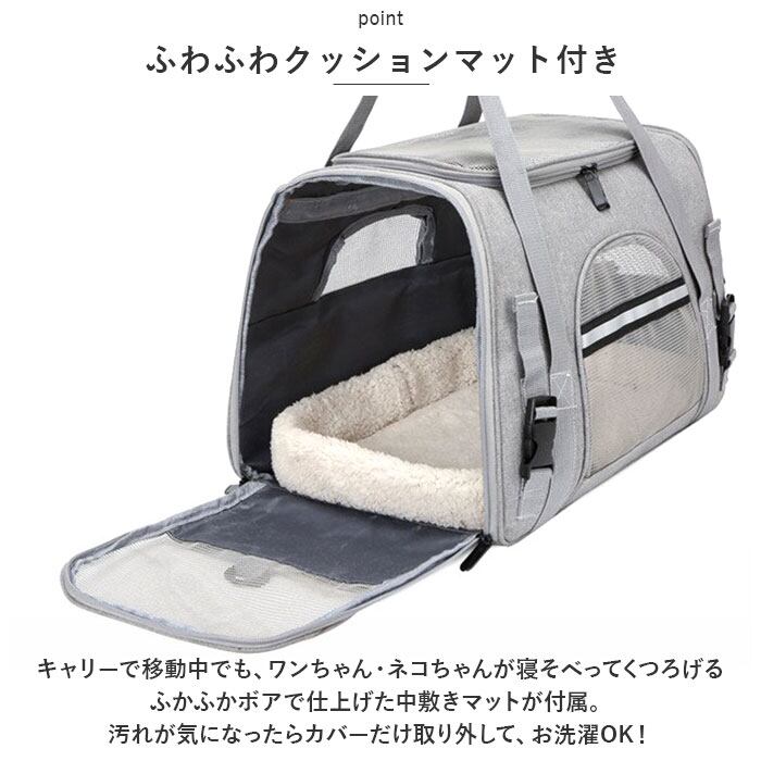 ・キャリーで移動中でも、ワンちゃん・ネコちゃんが寝そべってくつろげるふかふかボアで仕上げた中敷きマットが付属。汚れが気になったらカバーだけ取り外して、お洗濯OK!