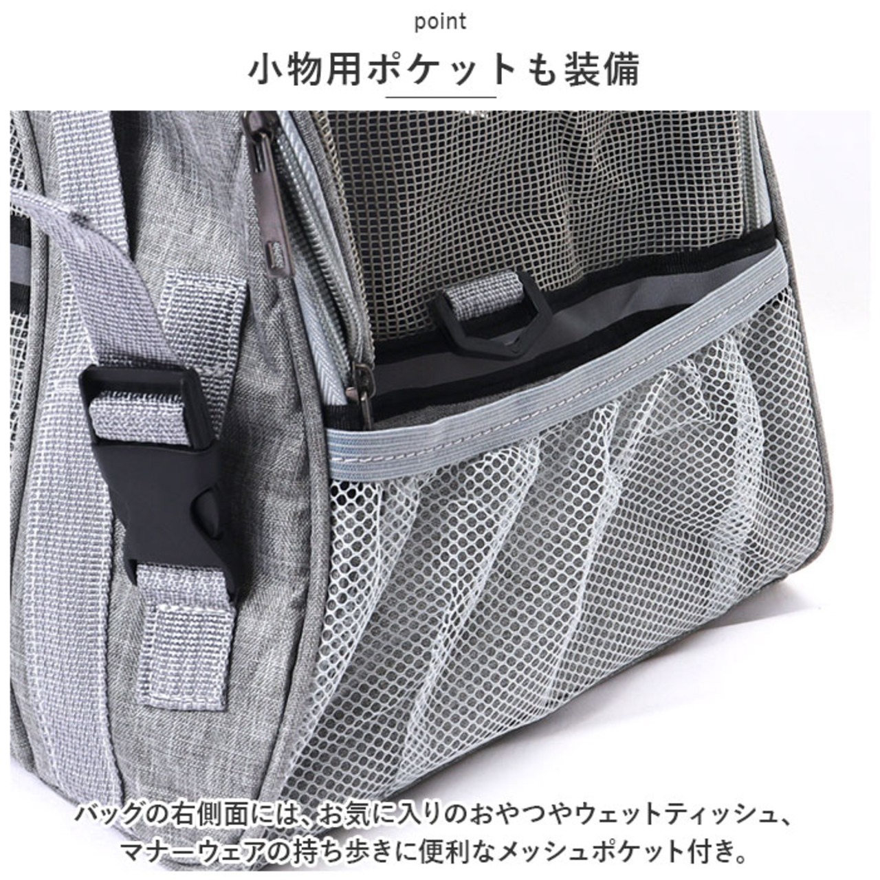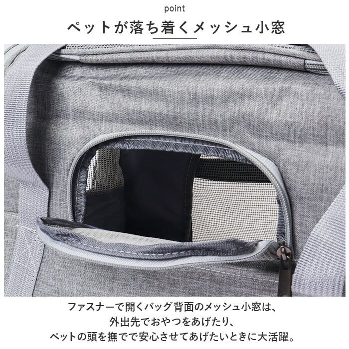 ・ファスナーで開くバッグ背面のメッシュ小窓は、外出先でおやつをあげたり、ペットの頭を撫でで安心させてあげたいときに大活躍。