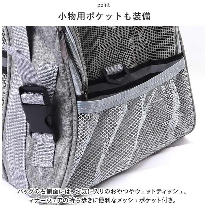 ・バッグの右側面には、お気に入りのおやつやウェットティッシュ、マナーウェアの持ち歩きに便利なメッシュポケット付き。