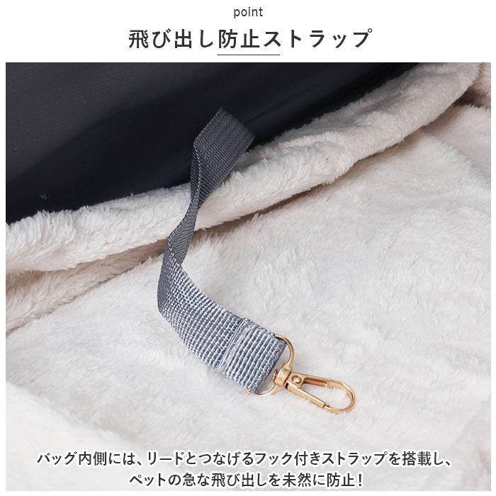 ・バッグ内側には、リードとつなげるフック付きストラップを搭載し、ペットの急な飛び出しを未然に防止!