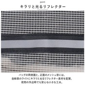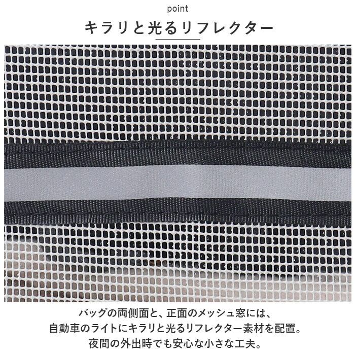 ・バッグの両側面と、正面のメッシュ窓には、自動車のライトにキラリと光るリフレクター素材を配置。夜間の外出時でも安心な小さな工夫。