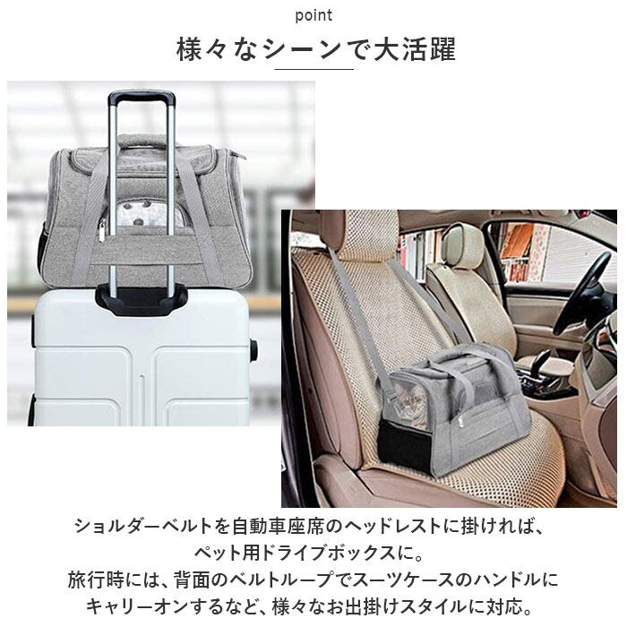 ・ショルダーベルトを自動車座席のヘッドレストに掛ければ、ペット用ドライブボックスに。旅行時には、背面のベルトループでスーツケースのハンドルにキャリーオンするなど、様々なお出掛けスタイルに対応。