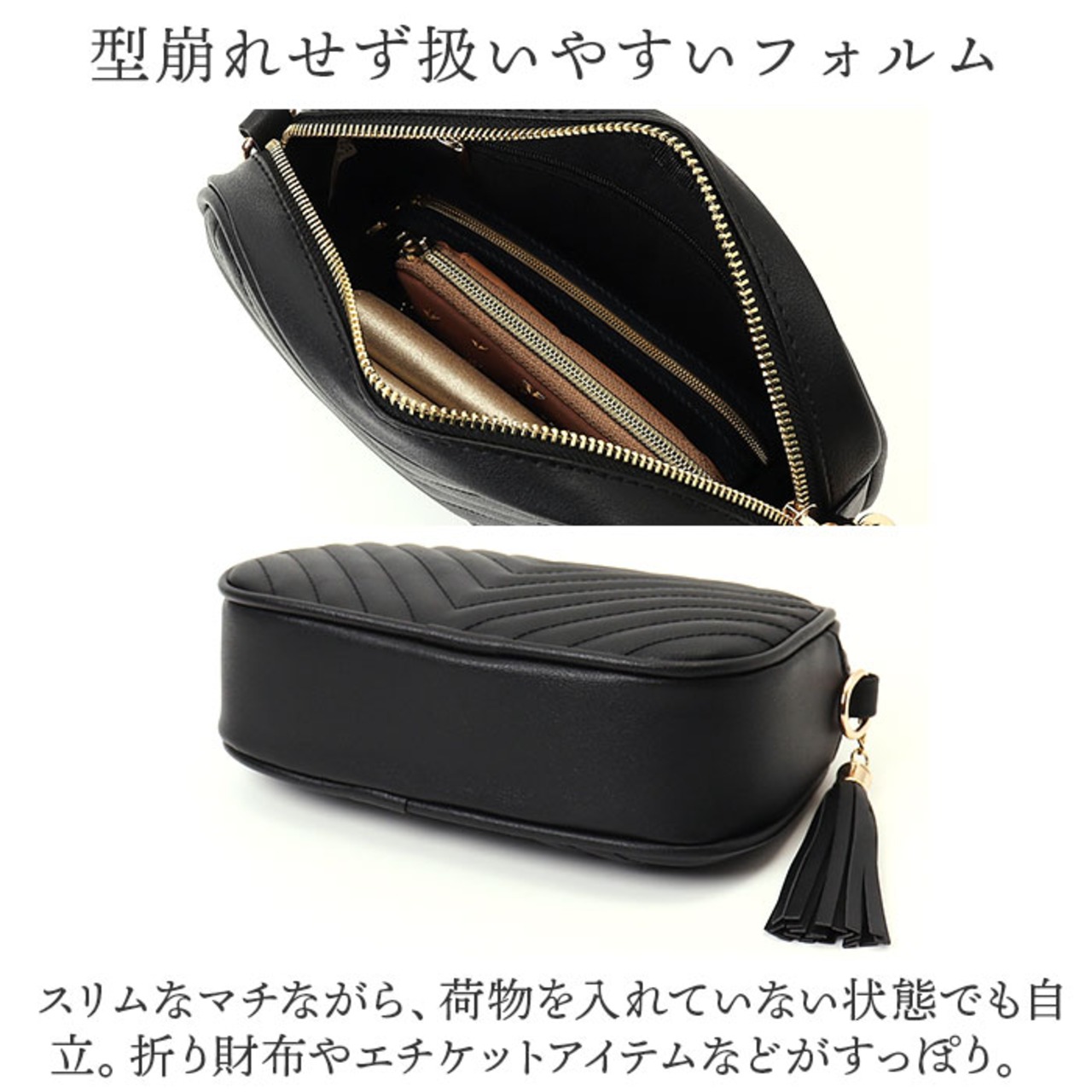 ・スリムなマチながら、荷物を入れていない状態でも自立。折り財布やエチケットアイテムなどがすっぽり。