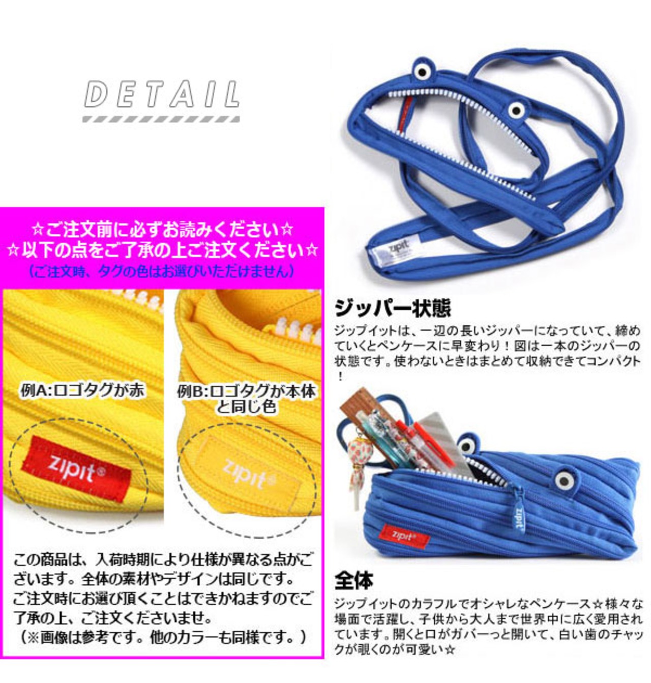 一見すると、ただの長いひも!!ところがジッパーを締めていくと、おしゃれなペンケースに早変わりです♪世界中の人々を虜にしているZipitの魅力はここにあります♪