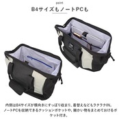 ・内側はB4サイズが横向きにすっぽり収まり、着替えなどもラクラクIN。ノートPCを収納できるクッションポケットや、細かい物をまとめておけるポケット付き。