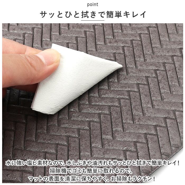・水に強い塩ビ素材なので、水しぶきや油汚れもサッとひと拭きで簡単キレイ!掃除機でゴミも簡単に取れるので、マットの表面を清潔に保ちやすく、お掃除もラクチン!