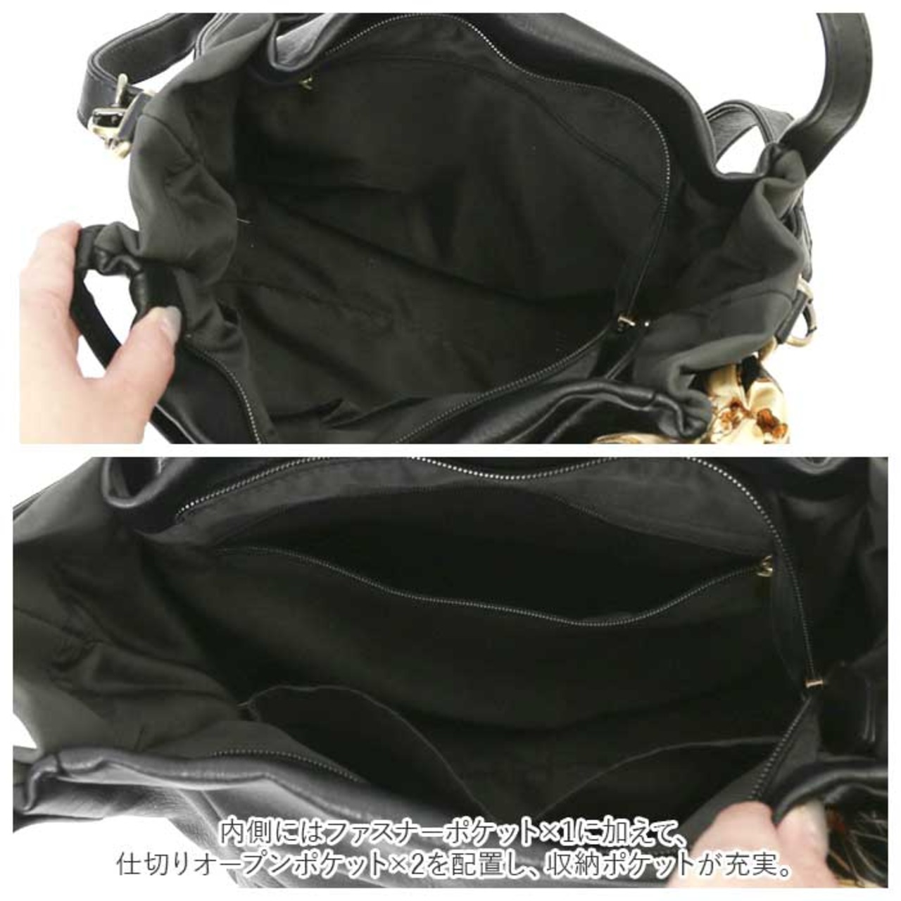 ・内側にはファスナーポケット×1に加えて、仕切りオープンポケット×2を配置し、収納ポケットが充実。キーケースやちょっとしたコスメなど小物類がスッキリしまえるのが嬉しいポイント!