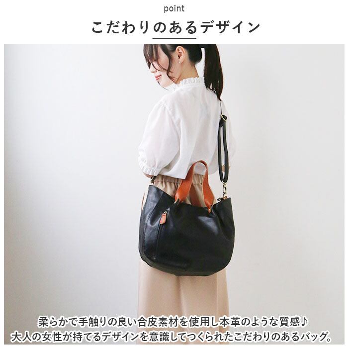 ・柔らかで手触りの良い合皮素材を使用し本革のような質感♪大人の女性が持てるデザインを意識してつくられたこだわりのあるバッグ。