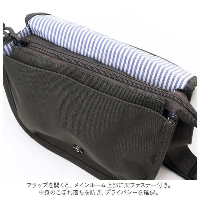 ・フラップを開くと、メインルーム上部に天ファスナー付き。中身のこぼれ落ちを防ぎ、プライバシーを確保。