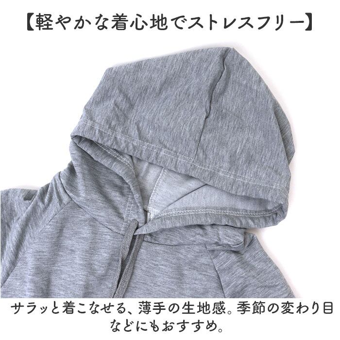 ・装飾のないシンプルなフード付きワンピース。落ち着いたベーシックカラー。