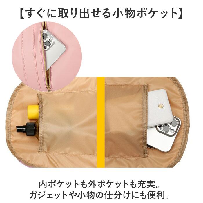 ・取り外せるショルダーパッド付きのベルトで、肩掛けもラク。シーンに合わせて使い分けOK。