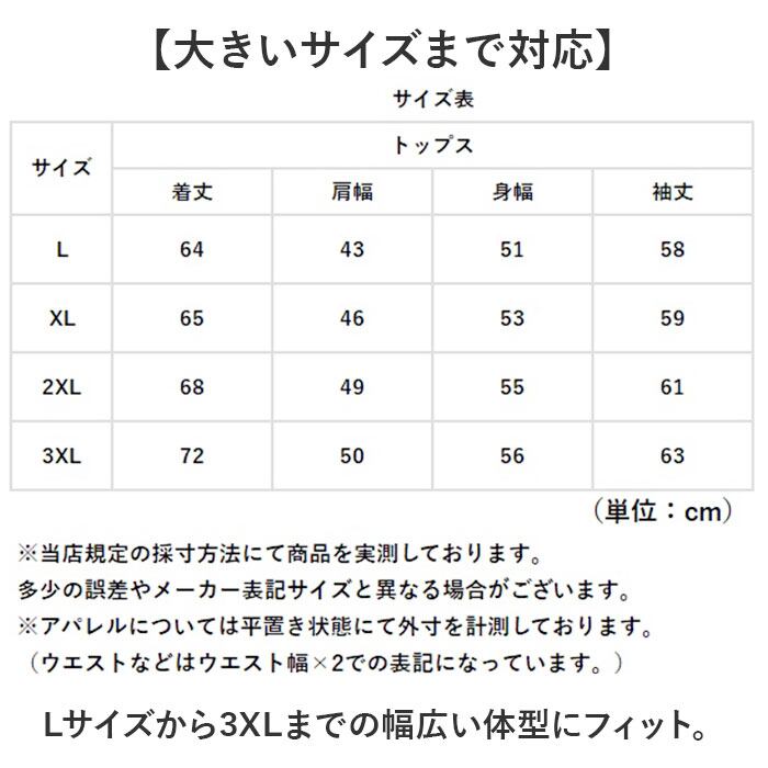 ・Lサイズから3XLまでの幅広い体型にフィット。
