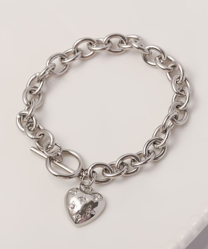 ・きらめくビジューをあしらったハートチャームと、程よい存在感のマンテルチェーンを組み合わせた、大人かわいいブレスレット。