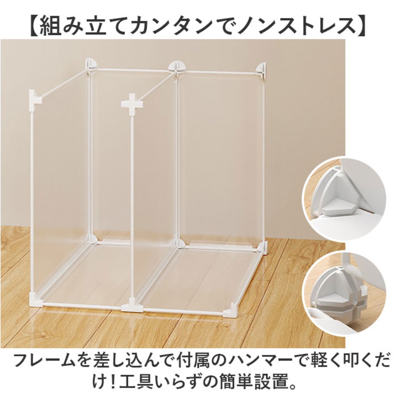 ・フレームを差し込んで付属のハンマーで軽く叩くだけ!工具いらずの簡単設置。