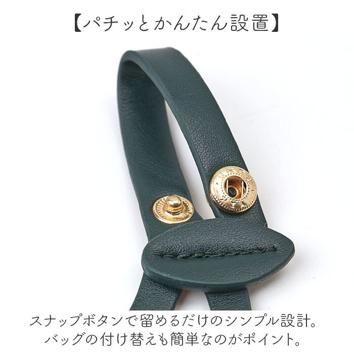 ・スナップボタンで留めるだけのシンプル設計。バッグの付け替えも簡単なのがポイント。