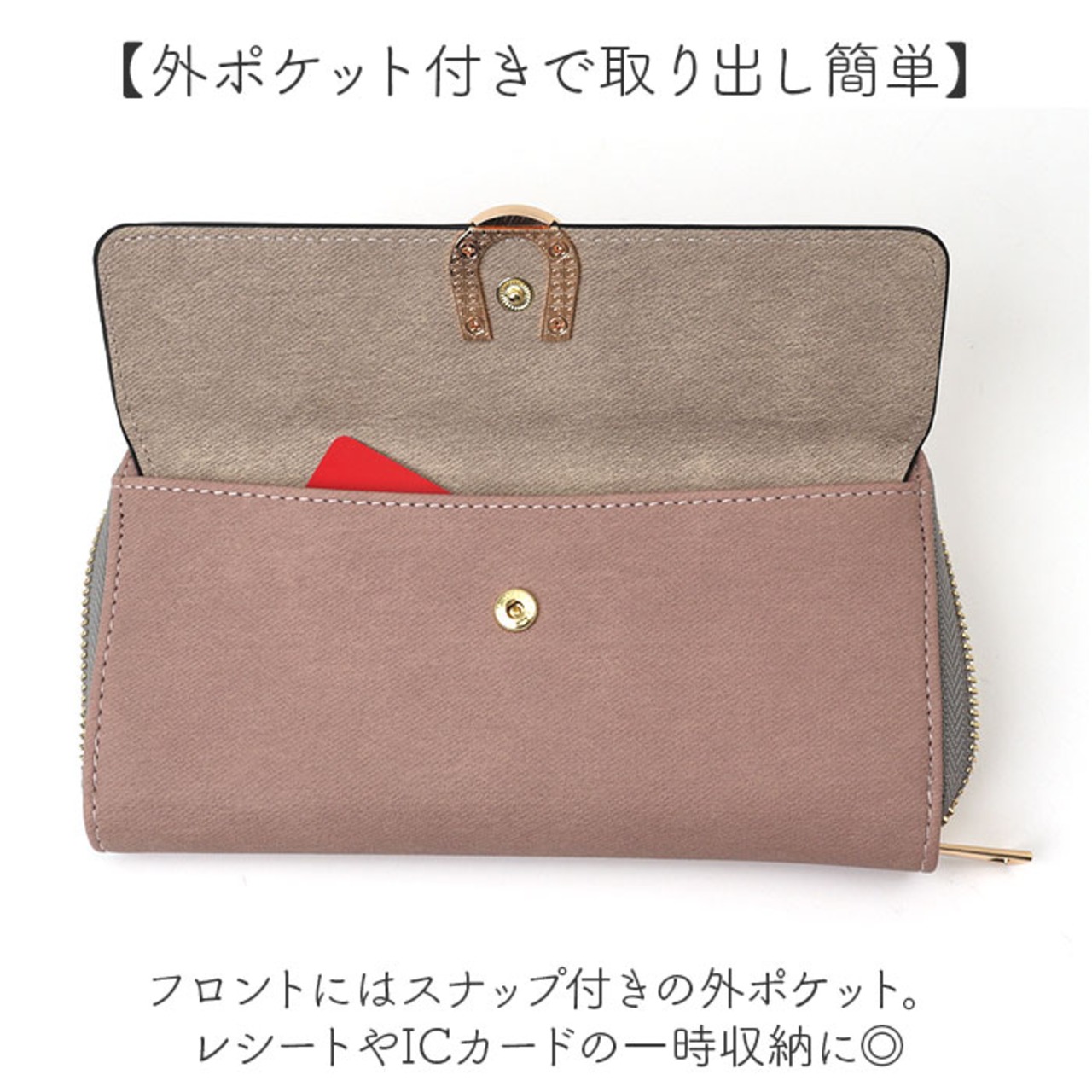 ・フロントにはスナップ付きの外ポケット。レシートやICカードの一時収納に◎