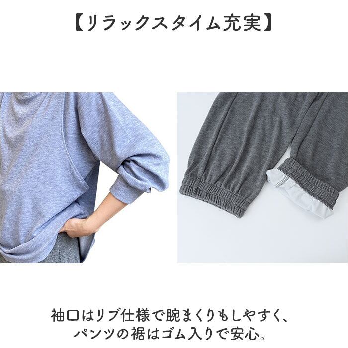 ・袖口はリブ仕様で腕まくりもしやすく、パンツの裾はゴム入りで安心。