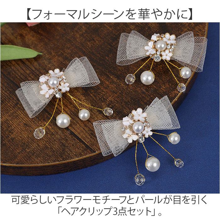 ・可愛らしいフラワーモチーフとパールが目を引く「ヘアクリップ3点セット」。