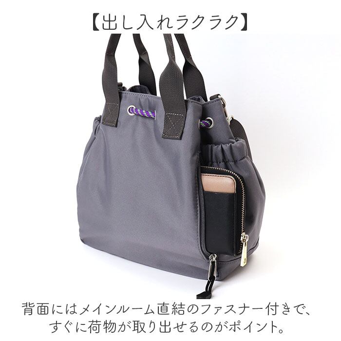 ・内側にファスナーポケット、両サイドにはペットボトルが入るポケット付き。
