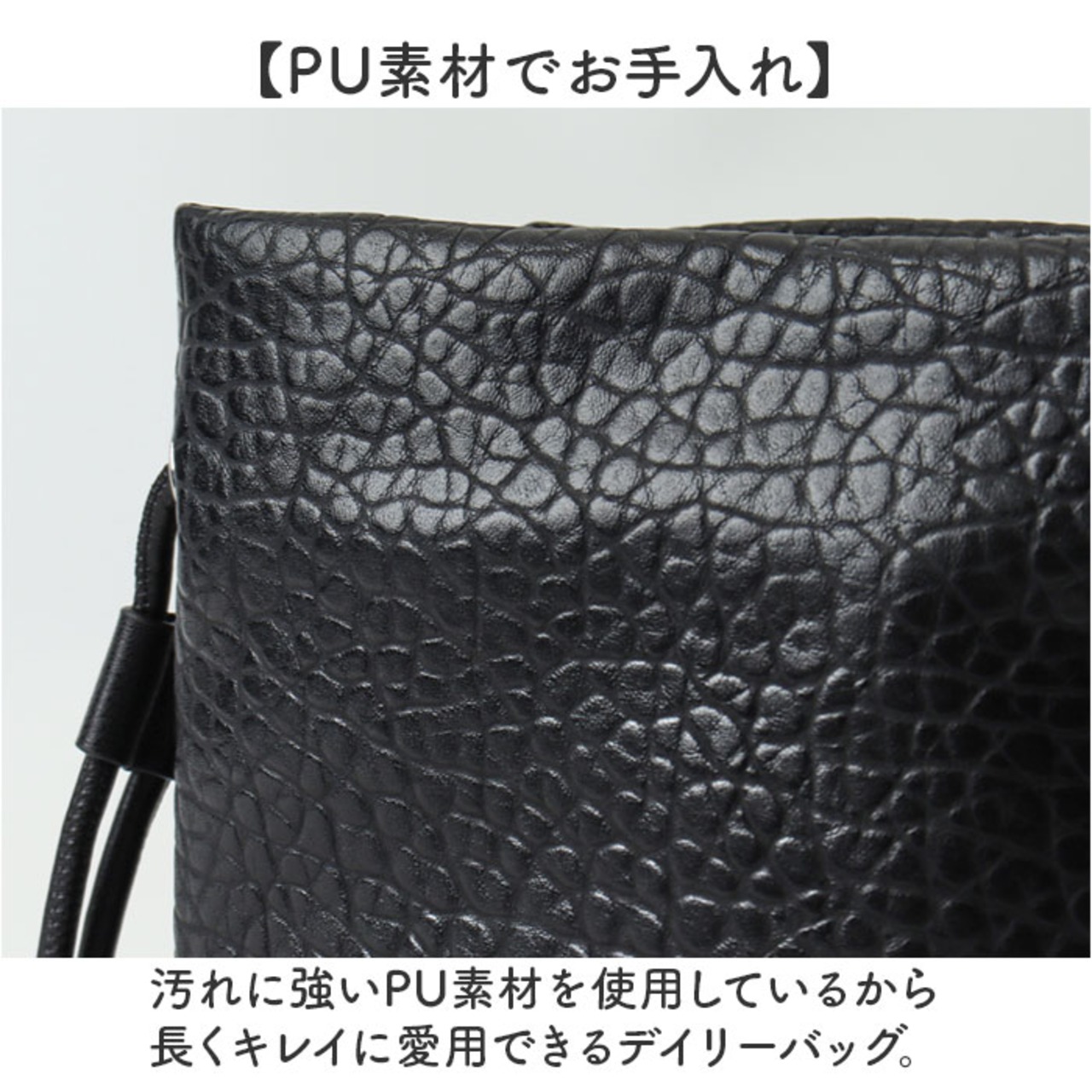 ・汚れに強いPU素材を使用しているから長くキレイに愛用できるデイリーバッグ。