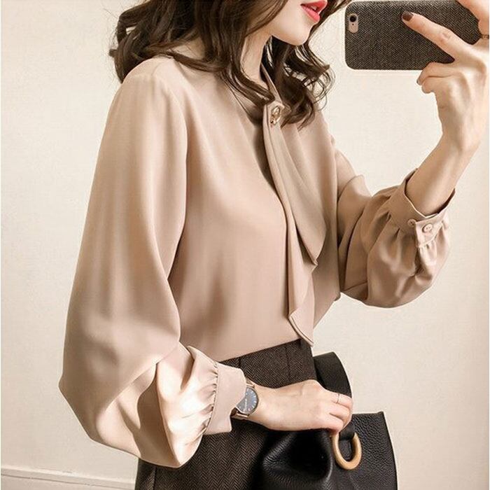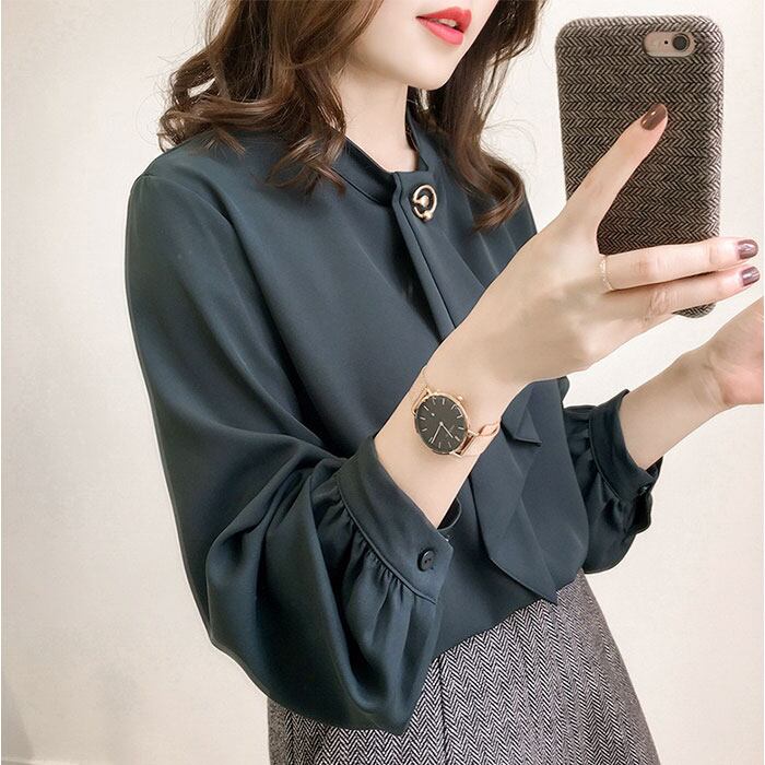 ・ゴールドのアクセントが目を引く「レディース ボウタイブラウス」