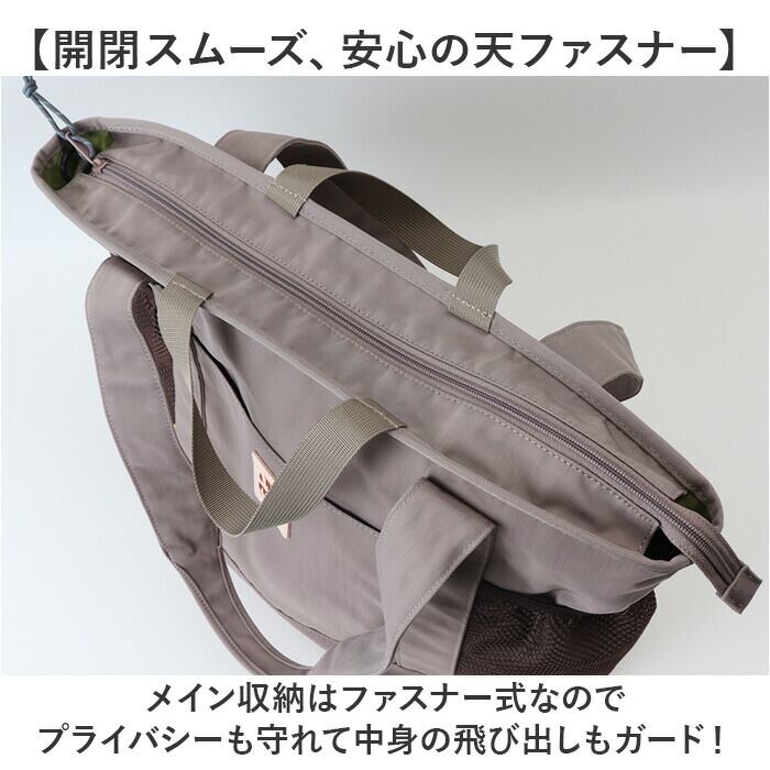 ・メイン収納はファスナー式なのでプライバシーも守れて中身の飛び出しもガード!