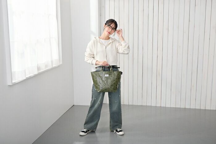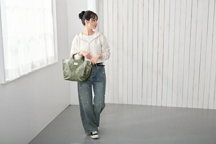 表地:綿(ノンフタル酸PVCラミネート加工)/裏地:ポリエステル/持ち手:綿(ノンフタル酸PVCラミネート加工)