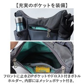 ・フロントに止水ZIPポケットやドロスト付きボトルホルダー、内部にはメッシュポケット付き。