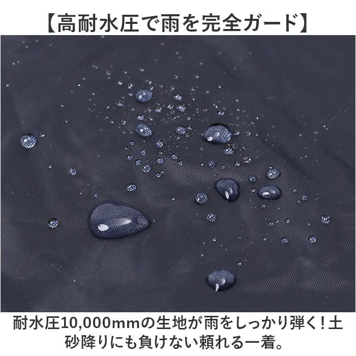 ・耐水圧10,000mmの生地が雨をしっかり弾く!土砂降りにも負けない頼れる一着。