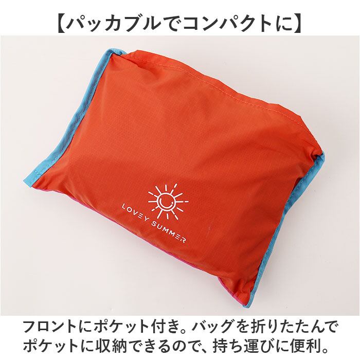 ・フロントにポケット付き。バッグを折りたたんでポケットに収納できるので、持ち運びに便利。