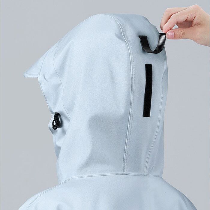・つば付きのフードは、ヘルメットの上からでもOK。面ファスナーとドローコードで、ぴったりフィット。