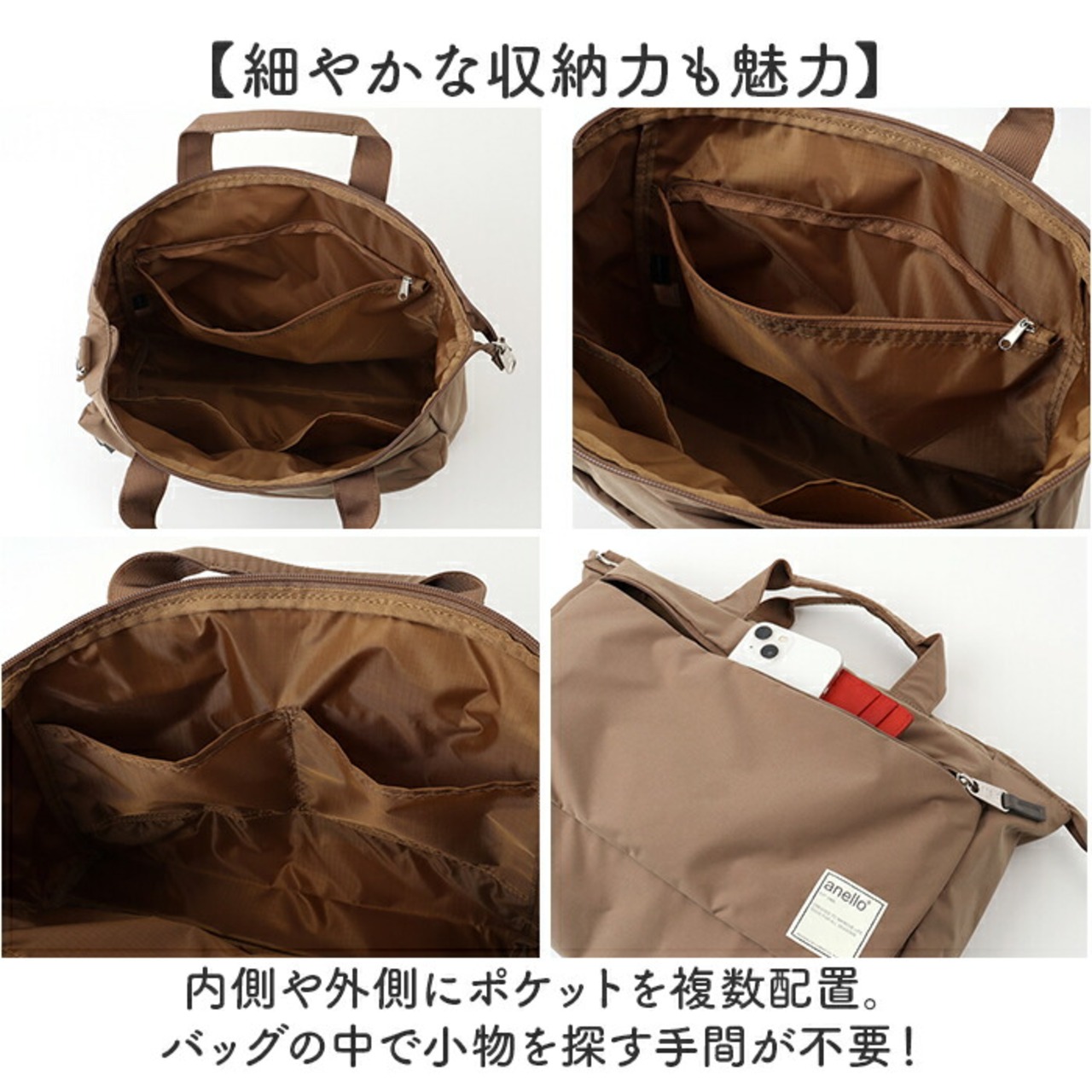 ・内側や外側にポケットを複数配置。バッグの中で小物を探す手間が不要!