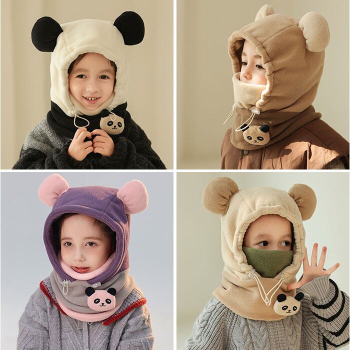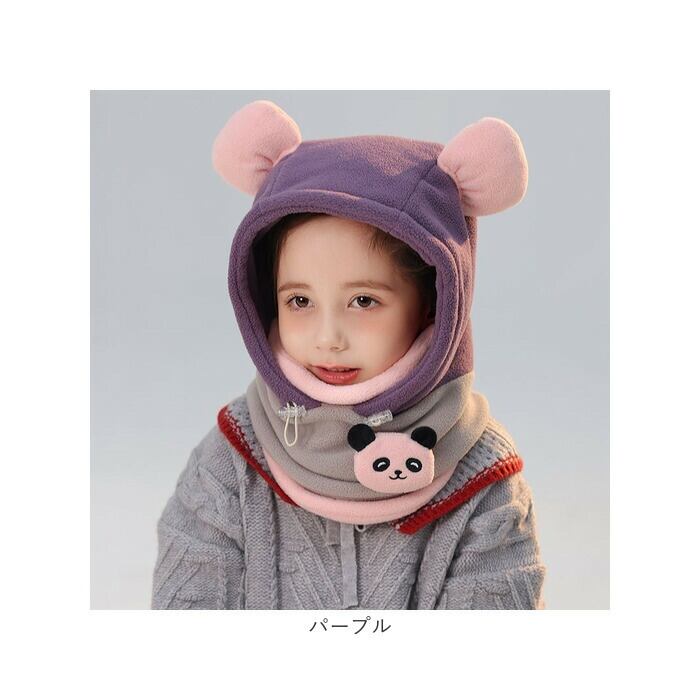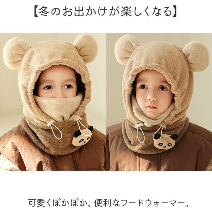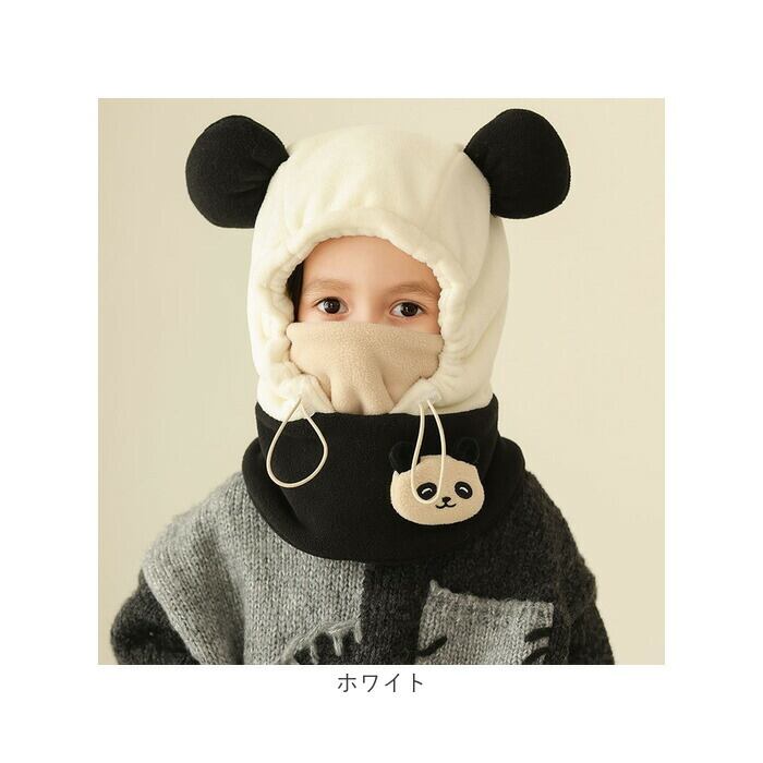 モコモコ 耳付きフードウォーマー キッズ ニット帽子 パンダ