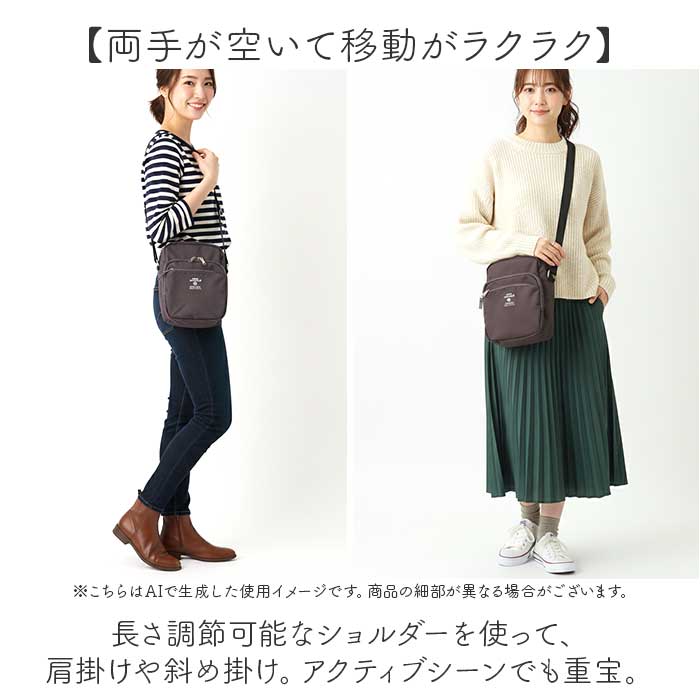 ・長さ調節可能なショルダーを使って、肩掛けや斜め掛け。アクティブシーンでも重宝。