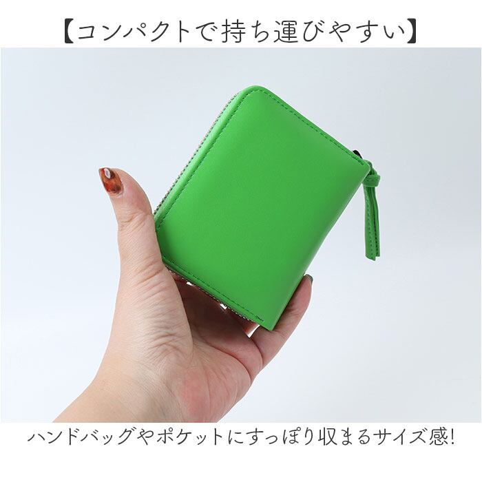・スナップボタンで開閉するボックス型の小銭入れは、中身が見やすく会計時もスムーズ。