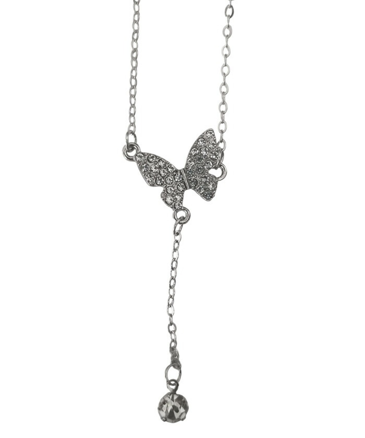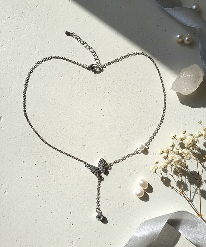・きらりと輝く蝶々のモチーフとチェーン部分のパールがアクセントとなった上品なネックレス。