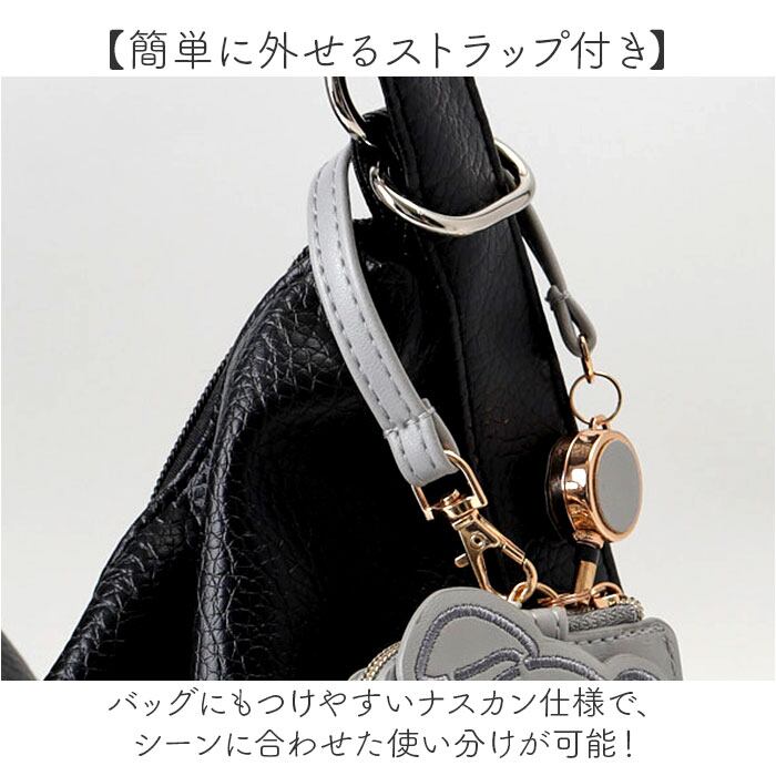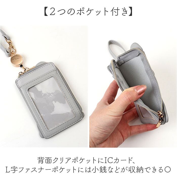 ・背面クリアポケットにICカード、L字ファスナーポケットには小銭などが収納できる〇