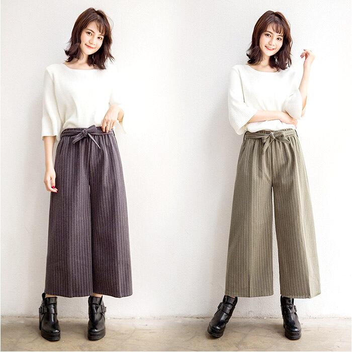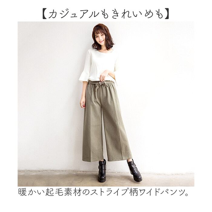 ・暖かい起毛素材のストライプ柄ワイドパンツ。