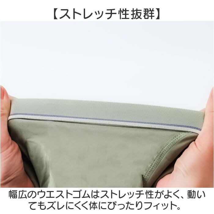 ・幅広のウエストゴムはストレッチ性がよく、動いてもズレにくく体にぴったりフィット。