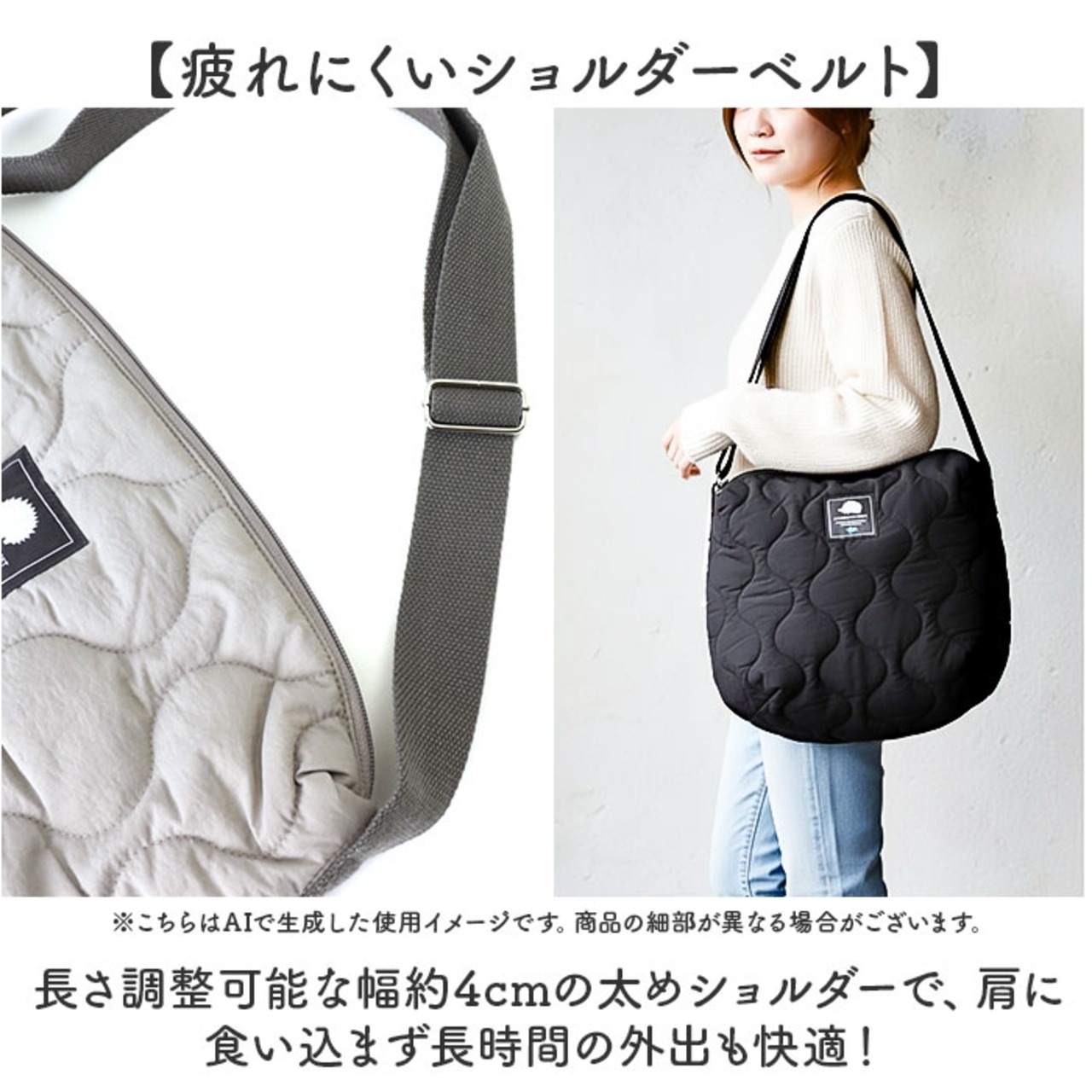 ・長さ調整可能な幅約4cmの太めショルダーで、肩に食い込まず長時間の外出も快適!